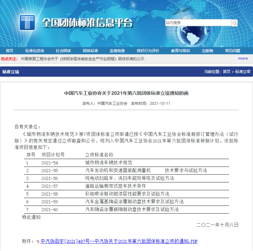 近日,中國汽車工業(yè)協(xié)會發(fā)布了《中國汽車工業(yè)協(xié)會關(guān)于2021年第六批團體標準立項通知的函》(中汽協(xié)函字【2021】487號)。通知指出,經(jīng)專家評審、審查、公示,北京天宜上佳高新材料股份有限公司(以下簡稱“天宜上佳”)申請的《汽車金屬基陶瓷涂覆制動盤技術(shù)要求及試驗方法》和《汽車陶瓷涂覆碳陶制動盤技術(shù)要求及試驗方法》 2項團體標準制定項目成功獲批立項。