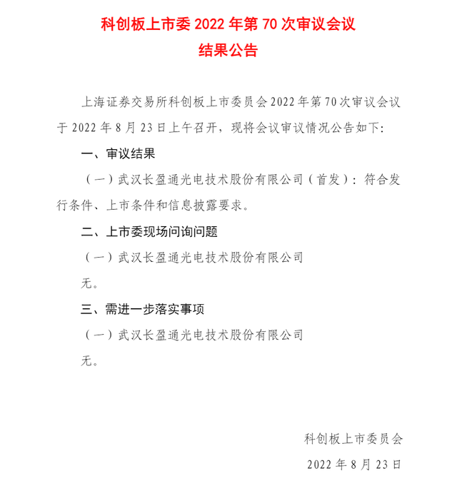 2022年8月23日,科創(chuàng)板上市委舉行了2022年第70次發(fā)審會(huì)議。天宜上佳持股的航天國(guó)調(diào)基金所投資的武漢長(zhǎng)盈通光電技術(shù)股份有限公司(簡(jiǎn)稱(chēng)“長(zhǎng)盈通”)成功通過(guò)審核。