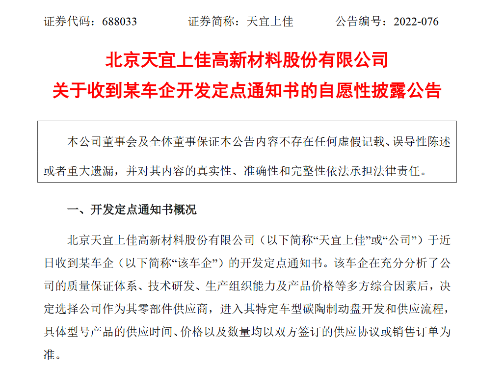 北京天宜上佳高新材料股份有限公司(以下簡稱“天宜上佳”或“公司”)于近日收到某車企(以下簡稱“該車企”)的開發(fā)定點通知書。該車企在充分分析了公司的質量保證體系、技術研發(fā)、生產(chǎn)組織能力及產(chǎn)品價格等多方綜合因素后,決定選擇公司作為其零部件供應商,進入其特定車型碳陶制動盤開發(fā)和供應流程,具體型號產(chǎn)品的供應時間、價格以及數(shù)量均以雙方簽訂的供應協(xié)議或銷售訂單為準。